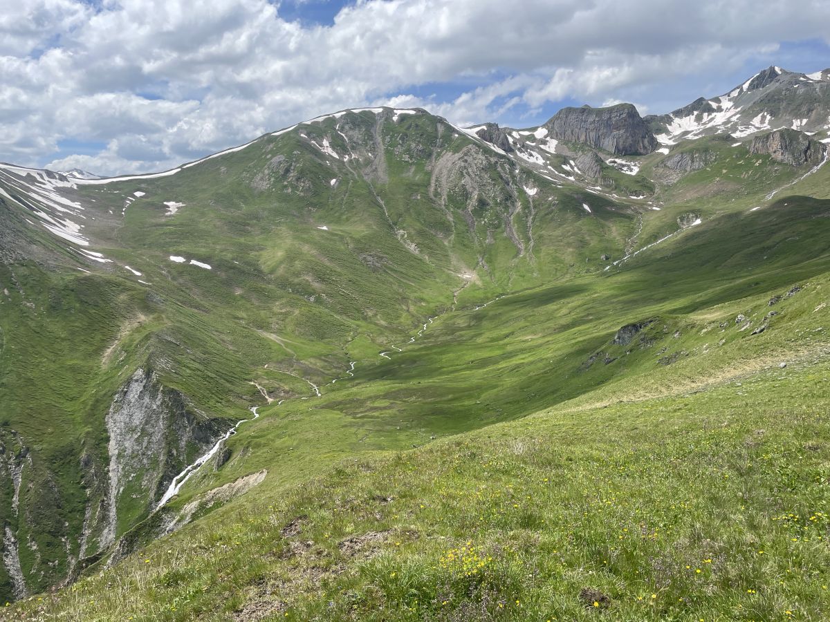 Am Morgen wandern wir von der Alp Trida oberhalb Samnaun los, über die Alp Bella, den Hang schräg hinauf auf den Spatlaskopf. Dort beginnt unser Abenteuer in den Schnittlauchgründen der Unter Malfrag. Sie sind von Weitem schon zu sehen: Dunkle Stellen in den saftig-grünen Wiesen, feuchte Abschnitte, die in der Talsohle unten an einen wild schäumenden Bergbach grenzen.