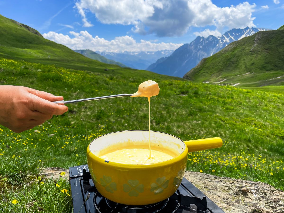 Blopp, blopp, blopp. Auf der Unter Malfrag liegt ein würziger Geruch in der Luft. Die Sonne brennt im Nacken. Auf der anderen Talseite rufen die jungen Murmeltiere, sie üben das Alarmzeichen. Und zwischen den Murmeltierrufen hören wir plötzlich auch den Ruf von Thomas. Das Fondue ist bereit!