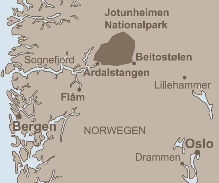 Nur eine Busfahrt und rund drei Stunden trennen Norwegens Hauptstadt von der alpinen Berg- und Gletscherwelt im Nationalpark Jotunheimen. Hier treffen die höchsten Bergriesen Norwegens auf langgezogene Fjorde, üppige grüne Bergtäler auf karges Hochgebirge. Und hier befinden sich über 250 Gletscher, der grösste ist Smørstabbreen mit 15 Quadratkilometern.