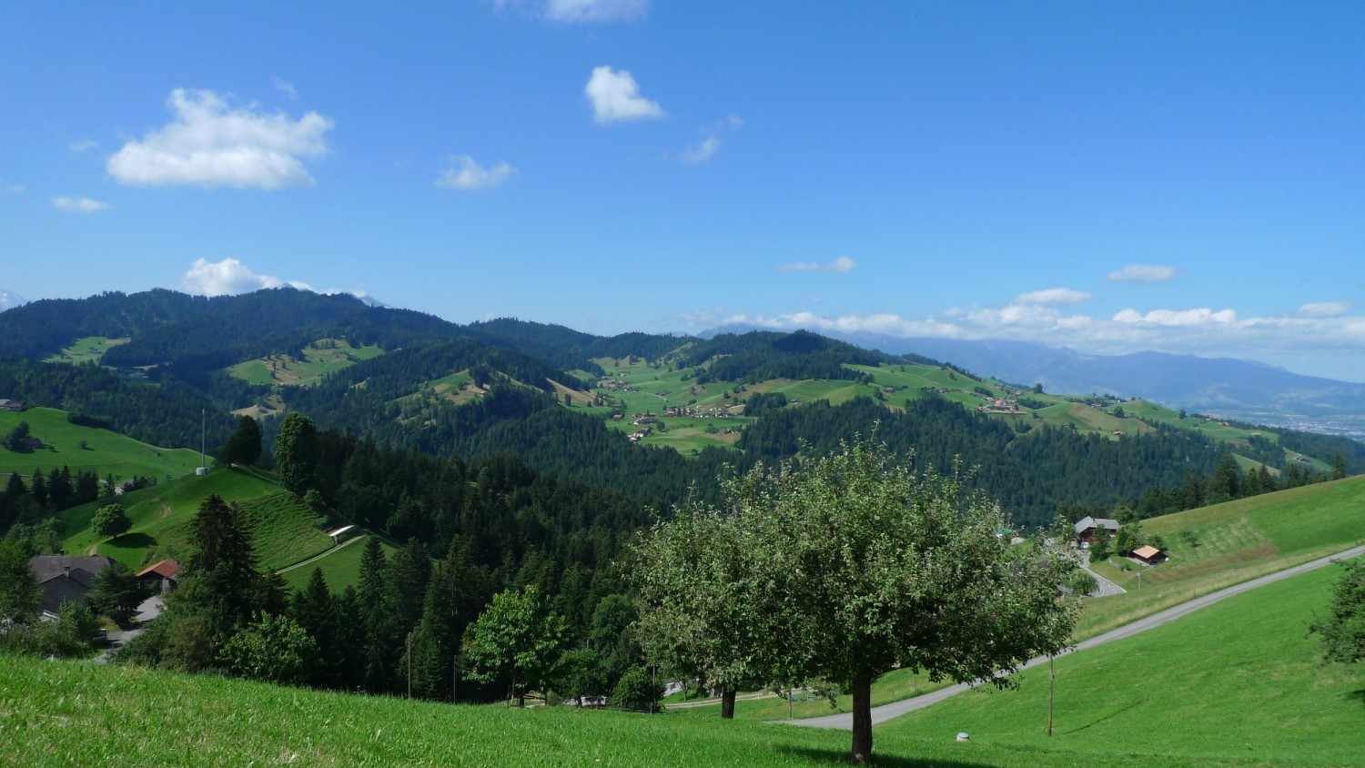 Der Hügelzug zwischen den tief eingeschnittenen Tälern von Emme und Rotache bildet eine landschaftlich reizvolle Region mit prächtigen Ausblicken auf den Hohgant, ins Justistal, zur Stockhornkette sowie über das Emmental. Sowohl die Landschaft als auch die stattlichen Bauernhöfe sind vom nahen Emmental geprägt. Auf dem Höhenrücken eröffnen sich eindrucksvolle Ausblicke über den Grünbergpass bis hin zu den Gipfeln der Berner Viertausender. Nach dem Abstieg wandern wir durch das Naturschutzgebiet der Hochmoorebene von Rotmoos.