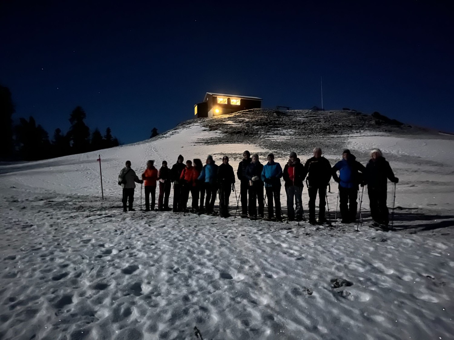 Schneeschuhe und Stöcke, warme Kleidung und Stirnlampe