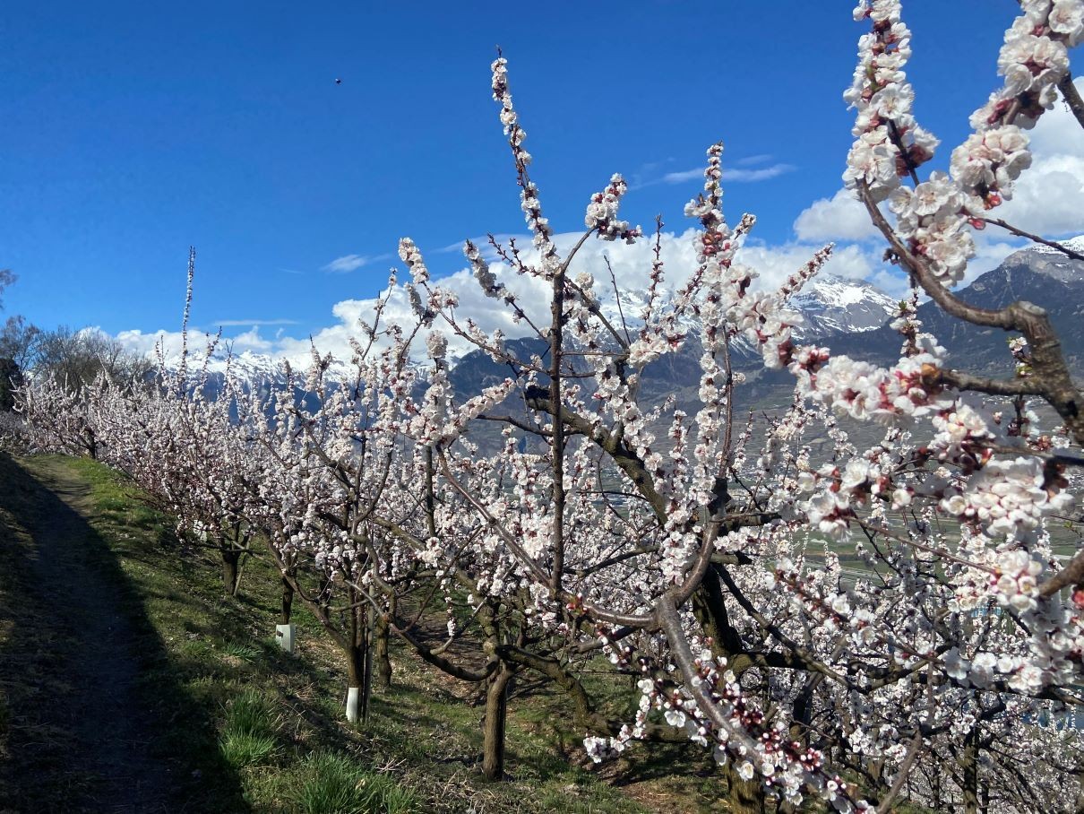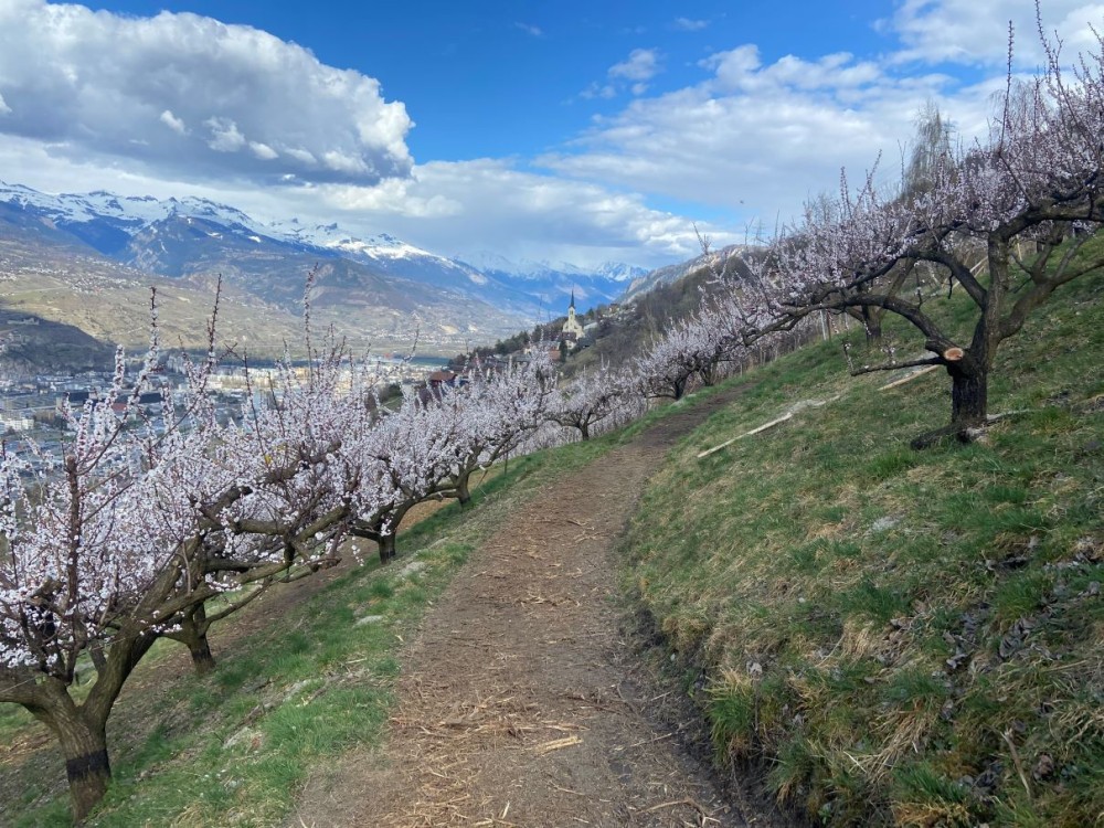 Zu Beginn des Frühlings schmücken sich die Aprikosenbäume an den Hängen südlich von Sion mit wunderschönen weißen Blüten, die mit dem dunklen Holz kontrastieren. Die Wanderung führt uns auch zu zwei Suonen auf unterschiedlichen Höhen, die mit den ersten Frühlingsblumen übersät sind.