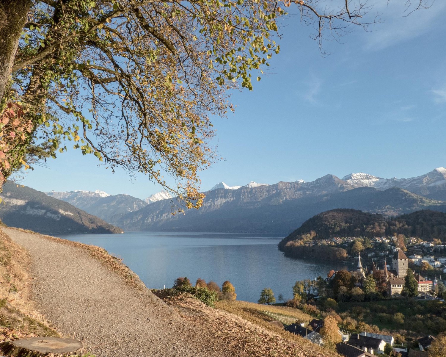 Mit stetigem Blick auf das Dreigestirn Eiger, Mönch und Jungfrau wandern wir durch die Thuner Altstadt, vorbei am Schloss Schadau und der Scherzligkirche sowie entlang dem Strandweg durch das Naherholungsgebiet. Anschliessend verlassen wir für kurze Zeit den See und überqueren die Kander. Wir erreichen Einigen mit seiner Kirche, die als Mutterkirche der zwölf 1000-jährigen Kirchen am Thunersee gilt. Über die Moosegg und durch den Wald von Spiezberg gelangen wir in die Spiezer Rebberge, deren Reben seit über 1000 Jahren existieren und steigen danach nach Spiez ab.