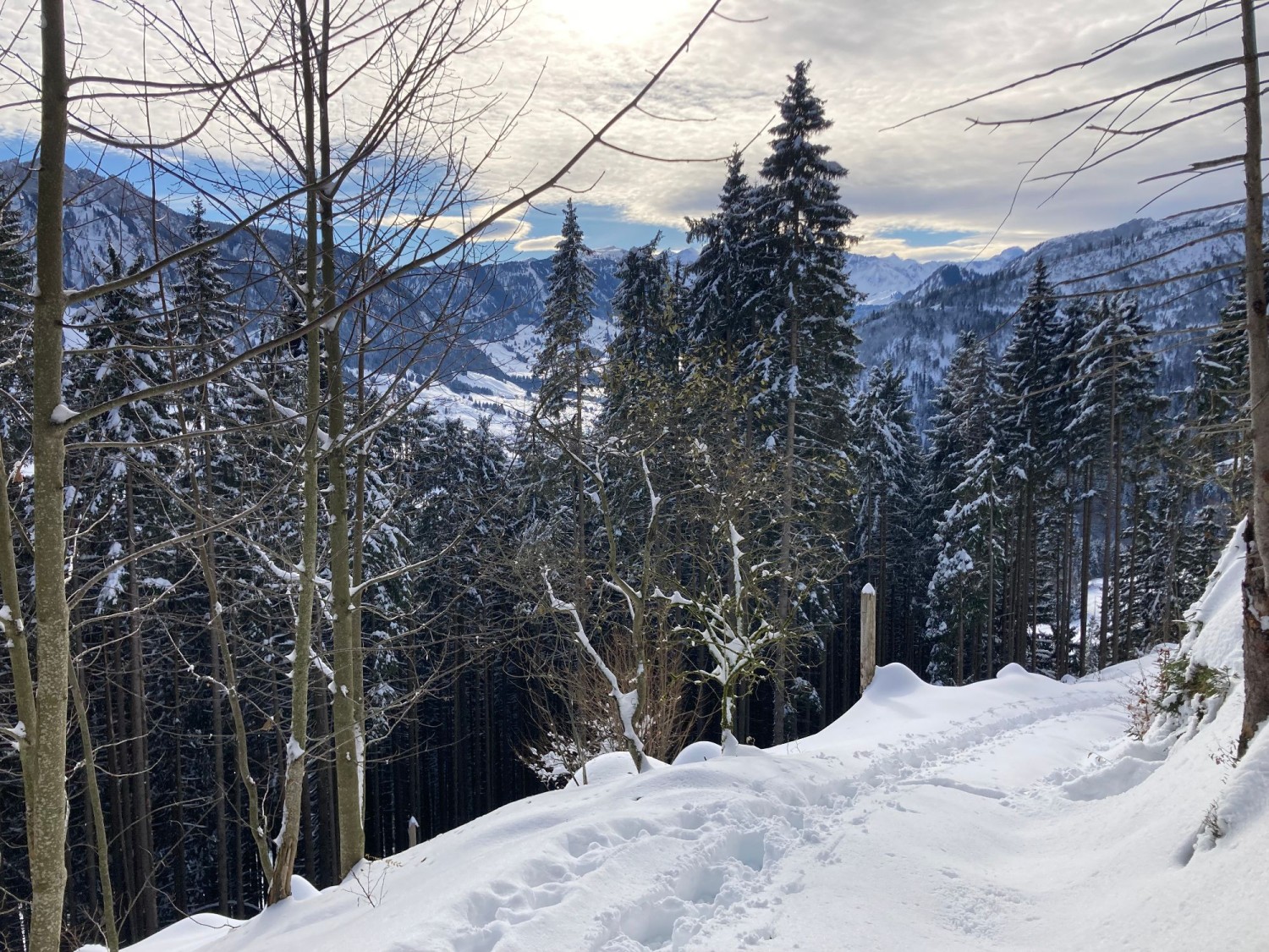 Schneeschuhe mit Stöcken, gutes Schuhwerk, dem Wetter angepasste Kleidung.