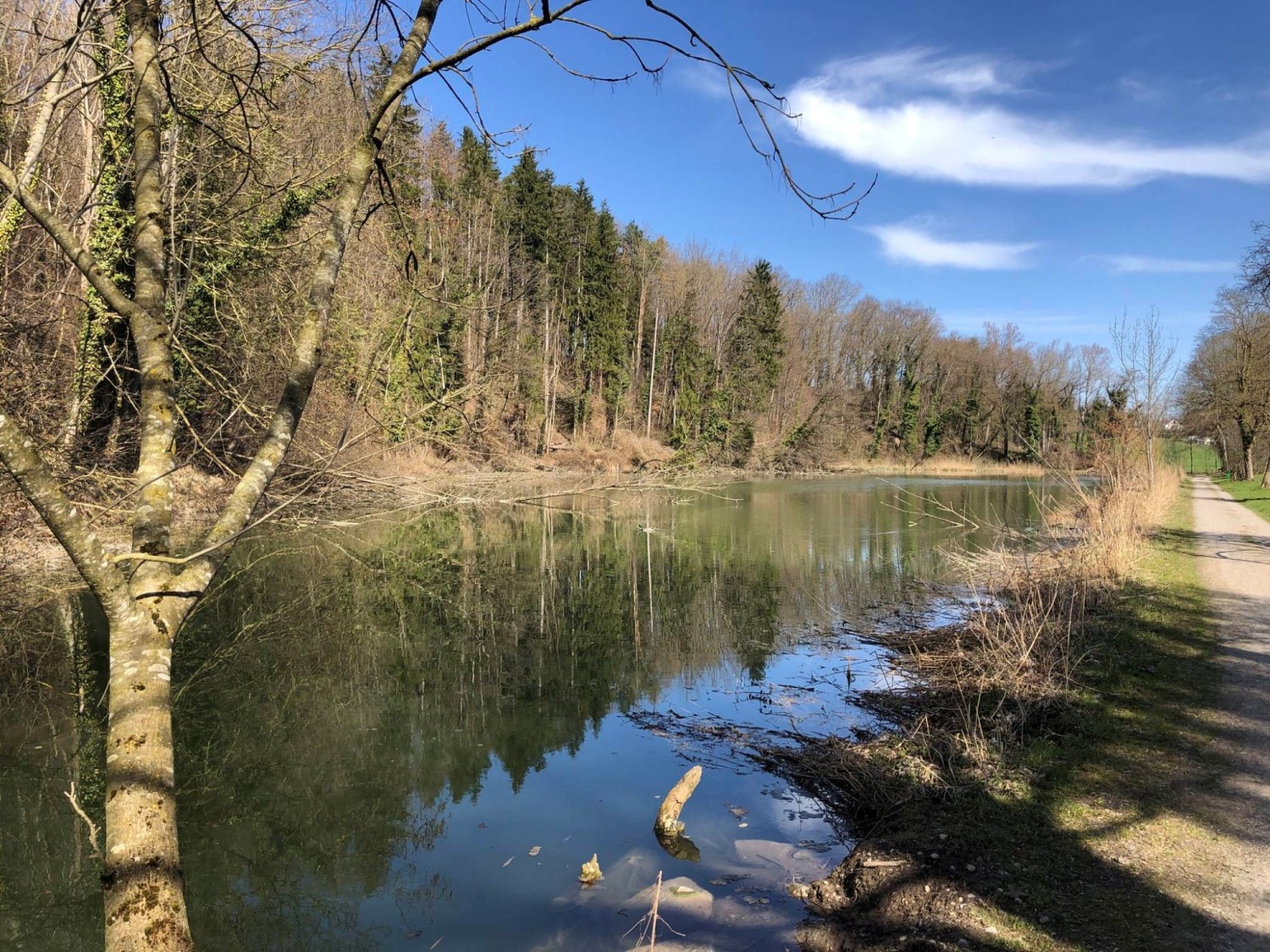 Murgabwärts geht es zum Webiweiher und danach über den Aussichtspunkt Dammbüel zum Bahnhof Wängi.