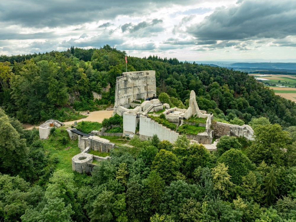 um die ausgedehnte Burganlage mit imposanten Überresten von Schildmauer,