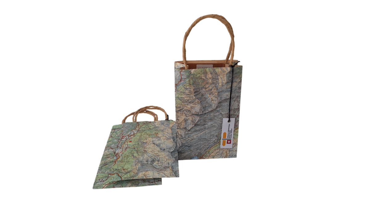 Jede dieser Taschen ist ein echtes Unikat: Sie wurden sorgfältig von Hand aus Original‑Wanderkarten der Schweizer Wanderwege und swisstopo gefertigt. Durch Upcycling erhalten die Karten ein zweites Leben – nachhaltig, charaktervoll und voller Schweizer Landschaftsgeschichte. Die Taschen sind ideal zum Verschenken oder als besondere Verpackung für kleine Mitbringsel. Produziert in Zusammenarbeit mit ARBES, einer Werkstätte für die Integration von Menschen mit Beeinträchtigungen – sozial, lokal und mit viel Liebe zum Detail.