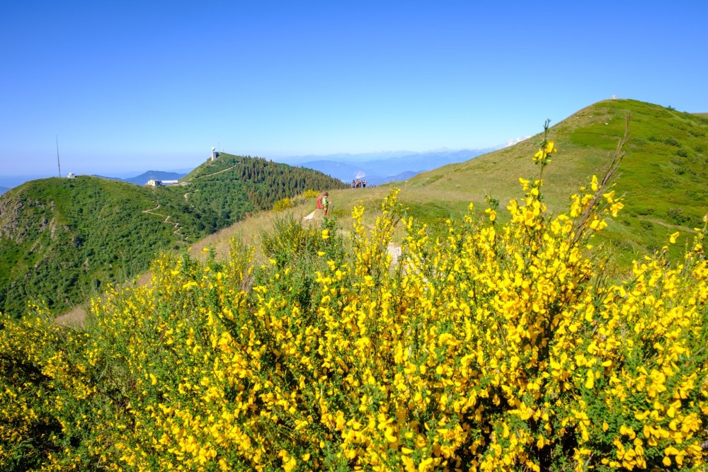 • Der Monte Lema taucht plötzlich hinter blühenden Ginstersträuchern auf.