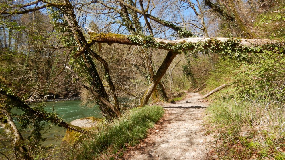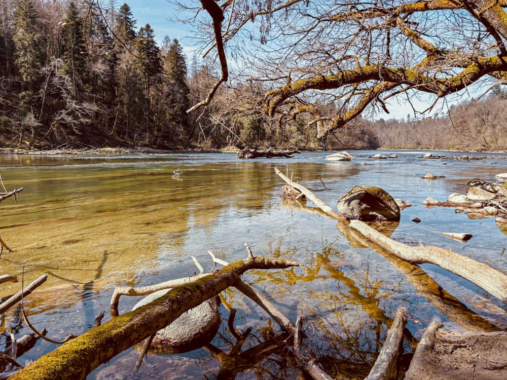 Bei Hermetschwil lohnt sich ein kurzer Abstecher hinauf zum Benediktinerinnenkloster St. Martin, das noch heute von neun Schwestern bewohnt wird. Auf einem Naturpfad geht es entlang der Reuss weiter – das Laub raschelt, die Sonne blinzelt durch das herbstliche Blätterdach. Die Luft surrt vom Vogelgezwitscher, ein Silberreiher hockt am gegenüberliegenden Flussufer.