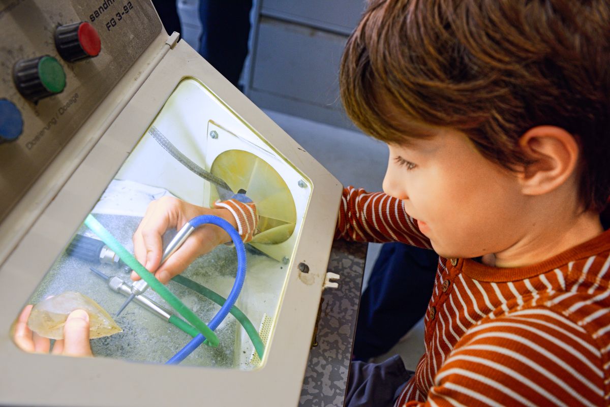 Les enfants peuvent alors s’y mettre. Ils examinent eux aussi le quartz, regardent où placer leur burin pour extraire un morceau de pierre particulièrement joli. «Si tu vois un scintillement, regarde de plus près. Tu trouveras peut-être un petit cristal de roche», les encourage Beat. «Ensuite, réfléchis comment tu peux extraire la pierre.»