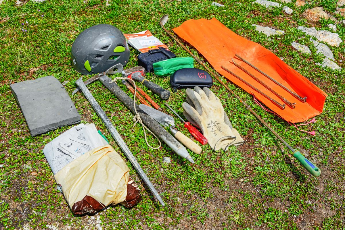 Un peu plus tard, lors du pique-nique, Beat sort son équipement du sac à dos: marteau, pointerolle et burin, mais aussi, dans l’herbe, un tournevis, une barre à mine, un piolet et un outil semblable à une cuillère dont le manche peut être rallongé par des éléments. Il permet d’extraire des cristaux depuis le fond d’un gouffre étroit. S’y ajoutent un casque, des lunettes de soleil, des jumelles, une pharmacie, une carte, des gants et un coussin pour les genoux. Enfin, des journaux pour emballer les trouvailles.
