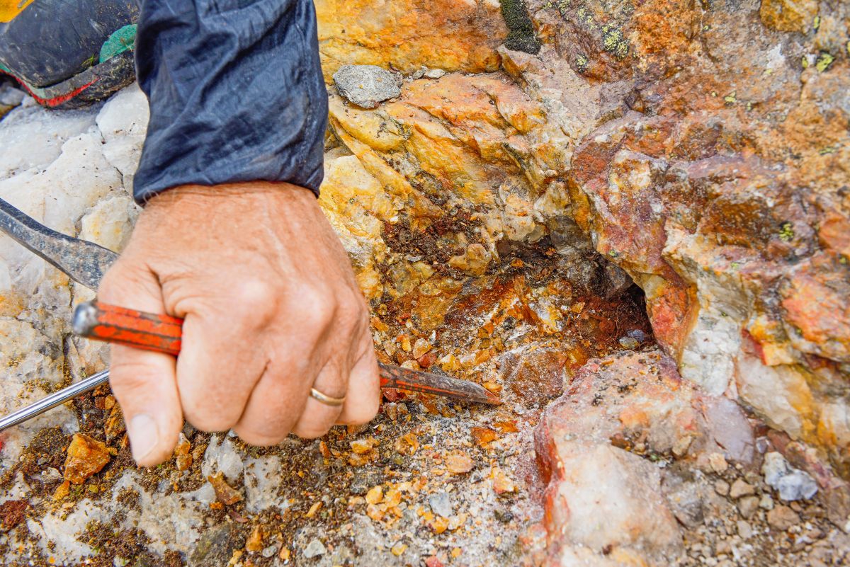 Il scrute attentivement les lieux jusqu’à ce qu’il voie un endroit digne d’intérêt: deux gros rochers fissurés, entre lesquels se trouve une bande de quartz avec de petites zones cristallisées. Il saisit le marteau et le burin et le travail commence. Beat met le fer en place, le frappe avec le marteau. Le son est clair quand le fer frappe le fer, sourd quand le fer travaille la pierre. De petits fragments glissent. Un plus gros morceau de pierre bouge de plus en plus, coup après coup. Beat le retire avec les doigts, mais constate, après un simple coup d’œil, qu’il ne renferme rien d’intéressant. Il le pose par terre pour vérifier immédiatement la cassure et voir s’il n’a pas mis à jour une nouvelle zone prometteuse.