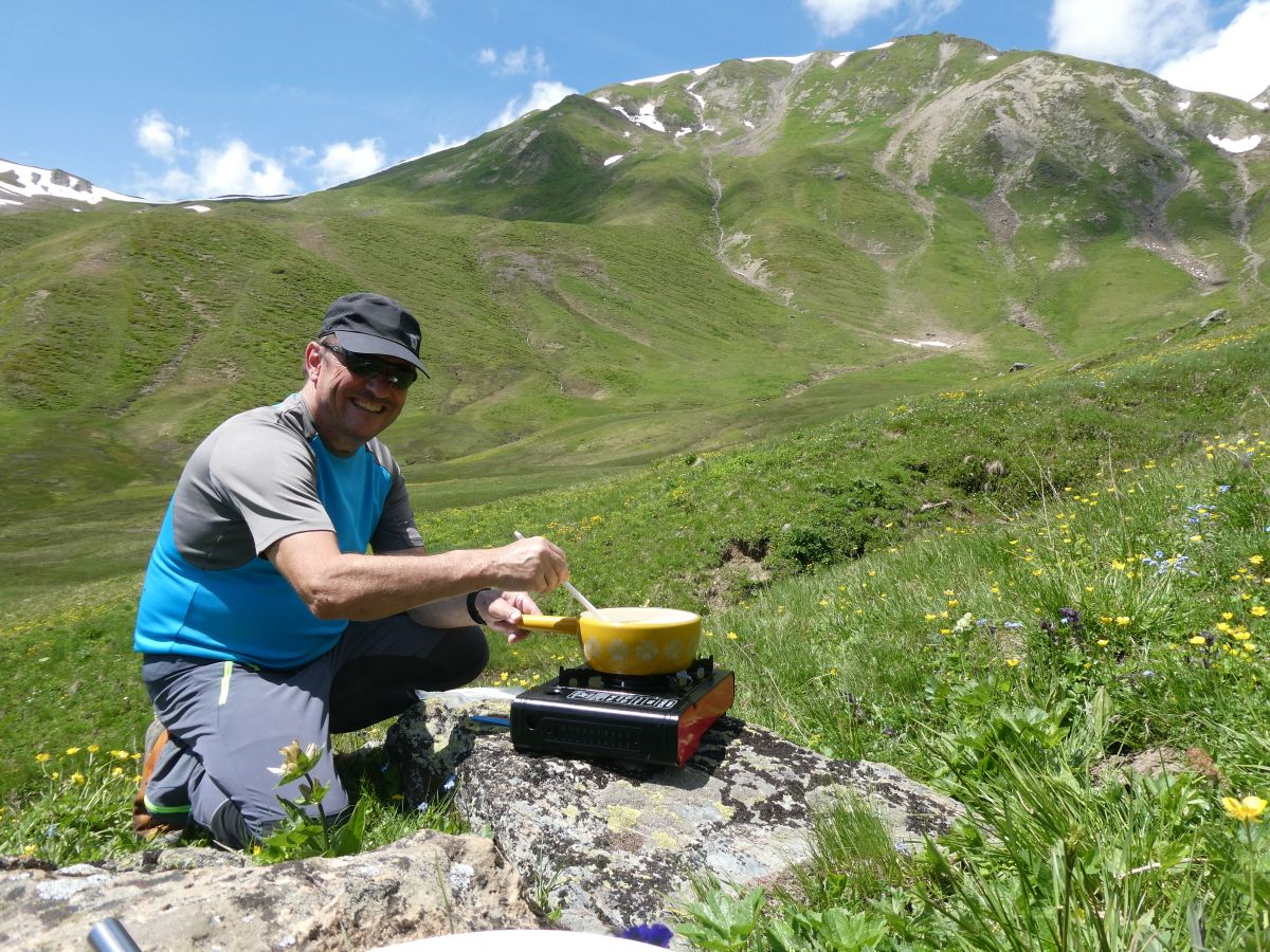 Pendant ce temps, Thomas s’est éloigné. Un peu plus haut sur la pente, il commence à préparer la fondue sur un grand rocher plat. Il allume le brûleur, pose le caquelon dessus et y verse le fromage. Il lui faut un certain temps avant de commencer à remuer le fromage fondu. Puis il nous appelle pour nous dire que nous pouvons bientôt manger.