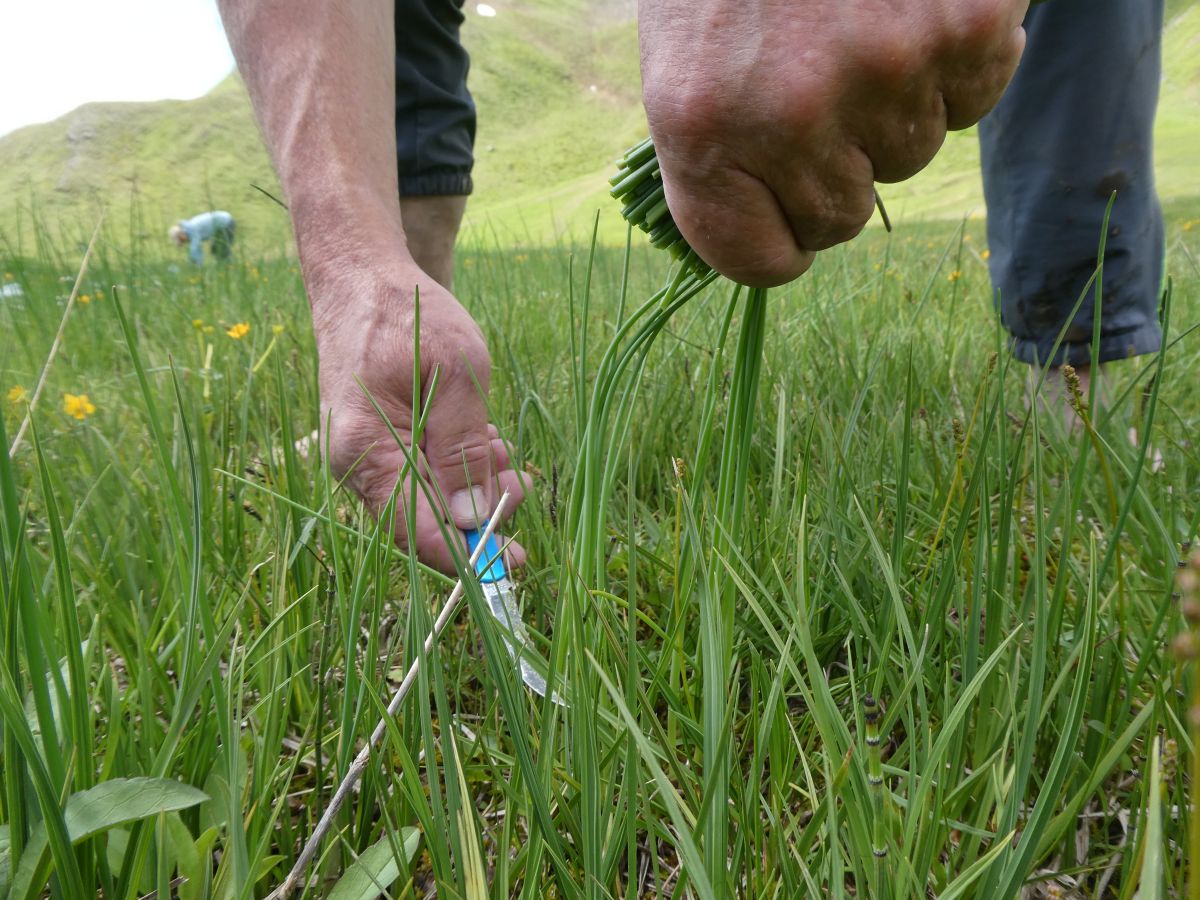Thomas Jenal nous accompagne. Il a grandi dans la vallée de Samnaun et dirige depuis plus de 30 ans le Sonnenhotel Soldanella-Sonneck. Il organise plusieurs fois par année une randonnée à la recherche de ciboulette avec ses hôtes, comme aujourd’hui. De Spatlasattel, nous contournons la cuvette et traversons le ruisseau qui marque la frontière avec l’Autriche avant de descendre dans l’un des champs vert foncé. Le sol est de plus en plus humide, nous nous enfonçons à chaque pas. Et puis, ça y est: Thomas pose son sac à dos, l’ouvre et en sort une bouteille de vin blanc qu’il met tout de suite au frais dans le ruisseau voisin. Une étape importante car, après tout, nous sommes venus pour déguster une fondue en plein air avec de la ciboulette fraîche et sauvage.