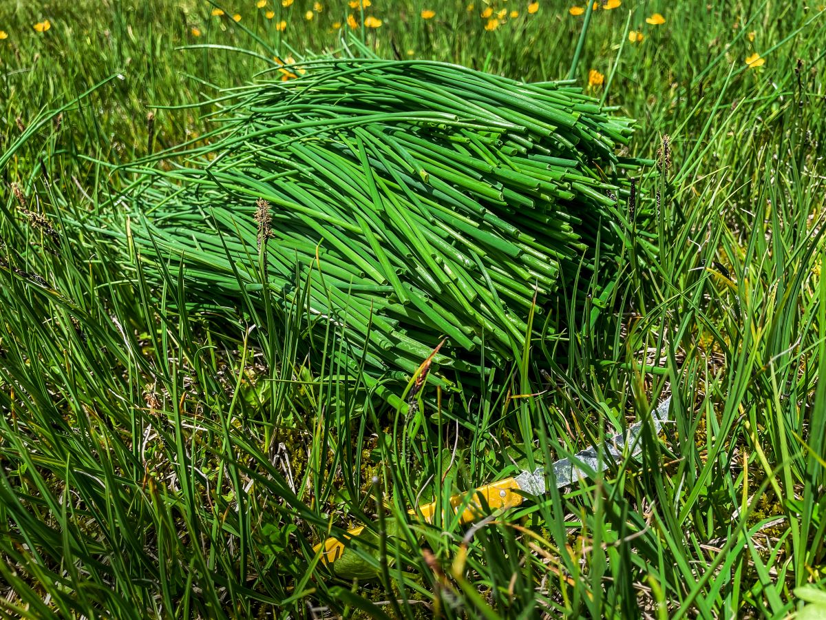 Mais nous sommes concentrés et ne l’entendons pas. La coupe a un côté méditatif. Clic, clic, clic. Un pas de plus, l’eau froide enveloppe à nouveau la cheville puis le pied s’enfonce dans la boue foncée, comme dans un puits sans fond. Mais il retrouve bientôt son équilibre. Debout, nous distinguons à peine la ciboulette dans l’herbe verte. Ce n’est qu’une fois accroupis que nous voyons les nombreux brins qui nous entourent, qui bougent légèrement dans le vent, sont plus laiteux, plus pâles que ceux de l’herbe. Ici et là, une fleur s’épanouit sur une tige.