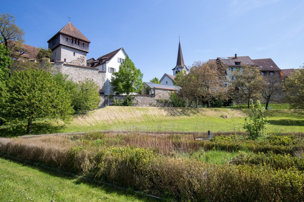 A la sortie de Diessenhofen, l’itinéraire passe devant le château Unterhof, avec l’église dans le dos.. Image: Daniel Fleuti