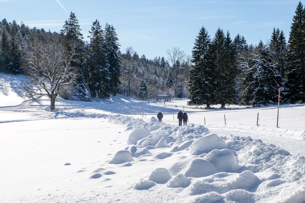 Von der Sonnenterrasse Braunwald führt ein schön angelegter Winterwanderweg hinüber zum aussichtsreichen Weiler Nussbüel. Die Route weist keine grossen Höhendifferenzen auf und verläuft grösstenteils ausserhalb des Skipistengebiets. Auf dem breiten Weg sind gelegentlich Gefährte unterwegs, allerdings nur in mässigem Tempo, praktisch emissionsfrei und mit einer Leistung von maximal 2 PS. Braunwald ist nämlich autofrei. Die doppelspännigen Kutschen, die zwischen dem Dorf und Nussbüel verkehren, versetzen einen sogleich in eine andere Zeit. Von der Bergstation der Standseilbahn Linthal-Braunwald geht es in leichtem Auf und Ab über das Gehöft Rietberg zur Wegverzweigung Bräch/Unterstafel. Von da an schmiegt sich der gepfadete Weg in die Flanke des Ortstocks. Der Berg wirft im Winter schon ab Mittag seine Schatten, sodass man die Sonne für eine Weile hinter sich lässt. Bei heikler Witterung besteht hier mitunter Lawinengefahr. Es kommt deshalb zwischendurch vor, dass die Route gesperrt werden muss. Nussbüel ist ein kleiner, sonnig gelegener Alpweiler mit einem Restaurant, das seit bald 100 Jahren von der Familie Ries geführt wird. Viele Gerichte des Hauses basieren auf der eigenen bäuerlichen Produktion. Ziemlich urchig ist unter anderem auch der Salatteller: Wo anderswo zur Mahlzeit eine Pfeffermühle gereicht wird, bringen die Wirtsleute hier eine Schabzigermühle und empfehlen, den würzigen Sauermilchkäse reichlich über die Rohkost zu streuen. Zum Dessert gibt es in der Wirtschaft Nussbüel Gugelhopf, der nach traditionellem Familienrezept täglich frisch gebacken wird. Die Rückkehr nach Braunwald verläuft zunächst auf gleicher Route. In Bräch/Unterstafel zweigt man hangwärts ab und gelangt leicht aufsteigend über Guflen nach Hüttenberg. Von dort geht es hinüber zur Bergstation der Standseilbahn.