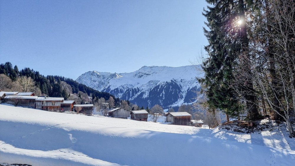 Wir nehmen den Weg, der weiter Richtung Ebnet und dann zum Stäckenmattboden führt. Der Schnee knirscht unter den Schneeschuhen, die man zum Beispiel an der Gondeltalstation mieten kann. Linker Hand führt ein Pfad empor zur nahe gelegenen Alp Tritt, die bei schönem Wetter im Beizli Käsespezialitäten anbietet.